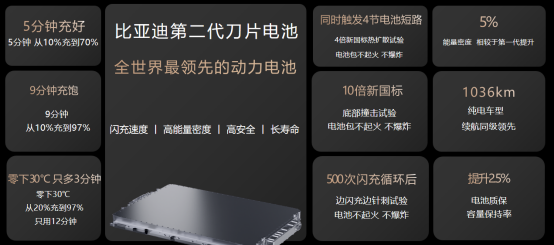 正因如此,比亚迪让“补能不再等待”成为了现实。2026年3月5日,第二代刀片电池及闪充技术正式发布,凭借“5分钟充好、9分钟充饱”的震撼表现,开启了极致闪充时代。在常温实测中,搭载该技术的车辆仅需5分钟即可实现电量从10%充至70%,而完成97%的近满电补能也仅需短短9分钟,真正实现了“一杯咖啡,满电出发”的便捷。即便面对零下30℃的极寒挑战,第二代刀片电池依然表现强韧,从20%充至97%仅需12分钟,较常温实测仅多出3分钟,彻底打破了新能源车“冬季补能难”的瓶颈。