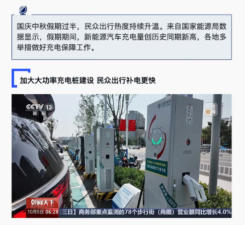 据央视新闻援引国家能源局数据,2025国庆中秋假期期间,新能源汽车充电量创历史同期新高,各地多举措做好充电保障工作。 10月1日零时至10月3日18时,全国高速公路充电量达到4380.93万千瓦时,同比增长51.33%,日均充电量是平日的2.54倍。 为保障车主顺利出行,各地继续加大充电桩、超级充电桩的建设。在山东威海至海港湾景区,4台液冷超级充电桩在这个假期投入使用,一辆搭载超充模块的新能源车辆...